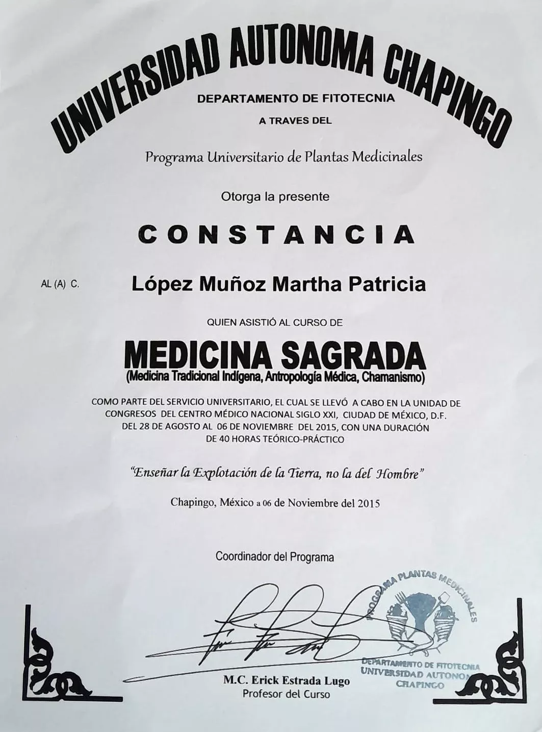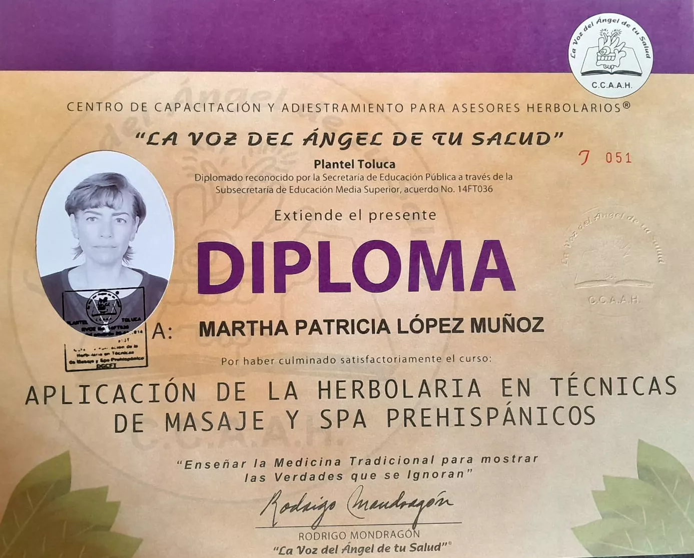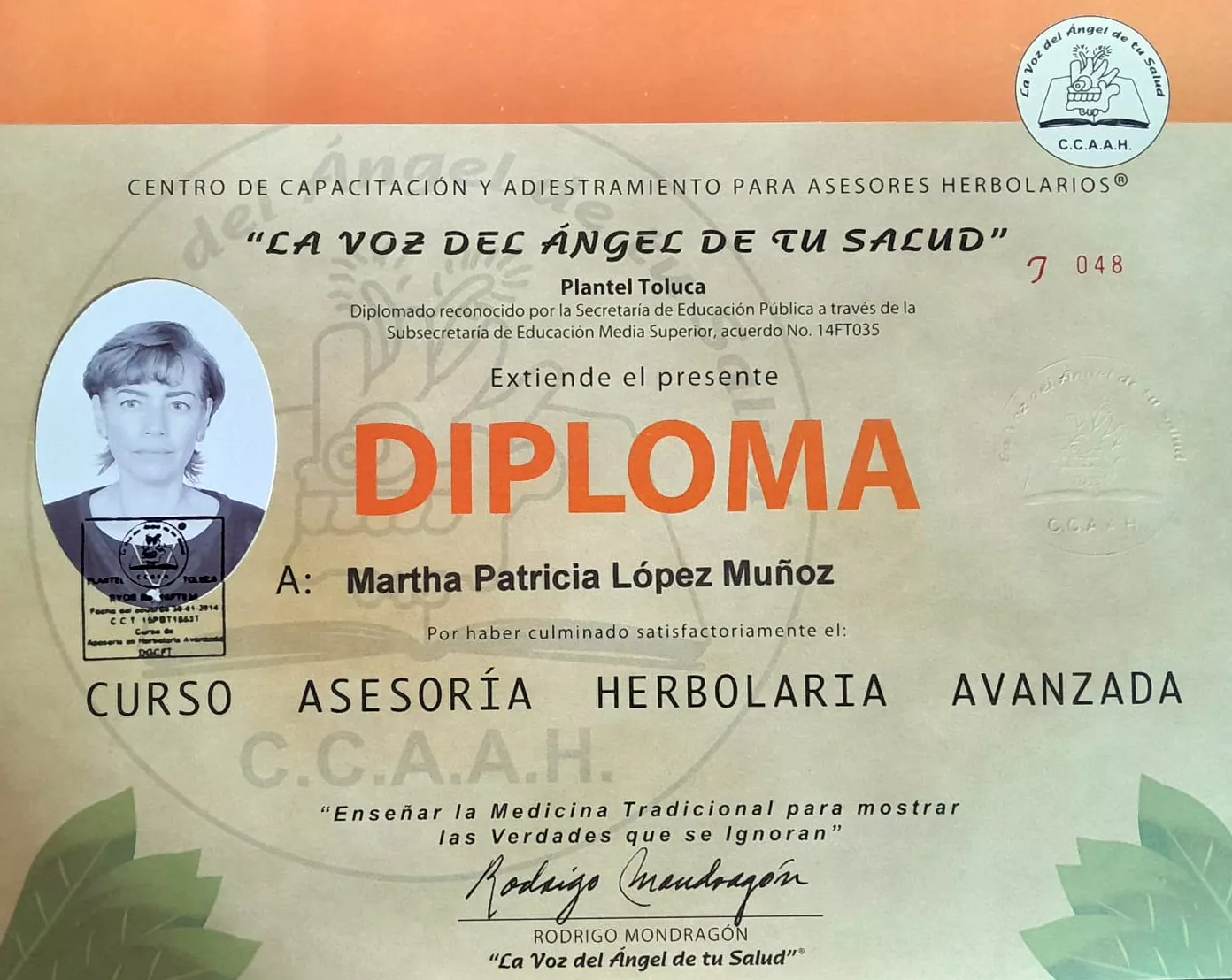 ● Cuenta con especialización en Fitoterapia clínica, Herbolaria mexicana y Medicina sagrada por la Universidad Autónoma Chapingo, además de formación en Herbolaria Avanzada y aceites esenciales con reconocimiento de la SEP.